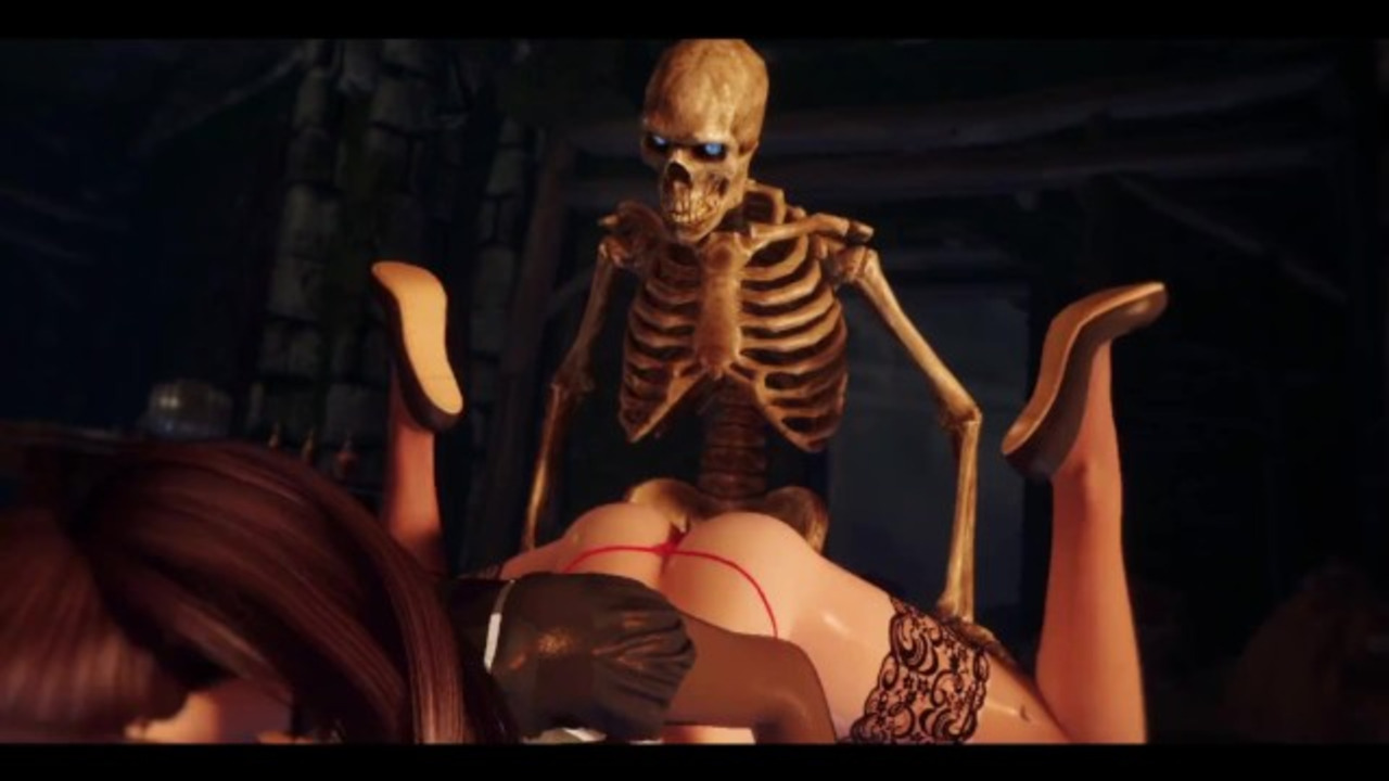 In a dark, dank dungeon, a nude Chinese girl mounts an animated skeleton POV style. She rides his bone-hard cock, and he pounds her hard from below. She moans as he gives her a creampie.