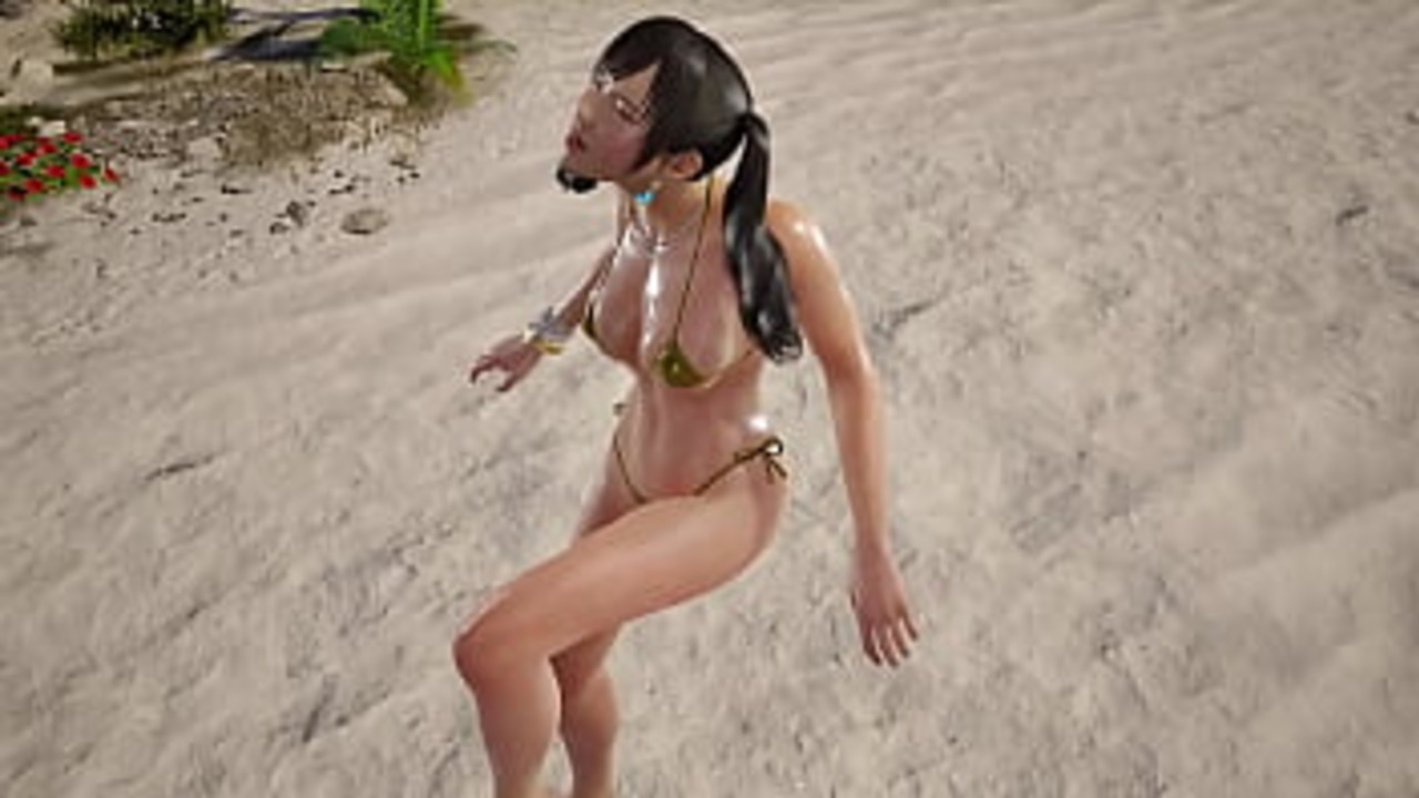 Ryona is a cute Asian girl wearing a revealing gold bikini. She has gorgeous big boobs that bounce as she moves around. He sucks her tits and makes her moan with pleasure.